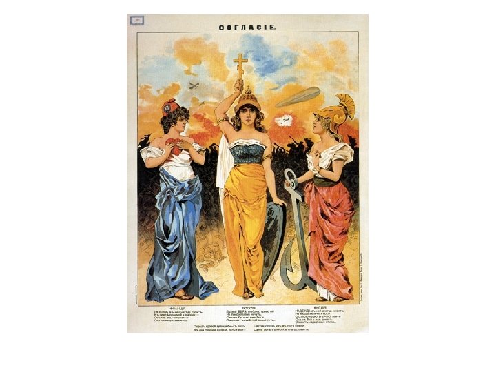 Alliances • 1894 - Franco-Russian alliance: – was a military alliance between the French Third Republic and the Russian Empire that ran from 1892 to 1917. – The alliance ended the diplomatic isolation of France and undermined the supremacy of the German Empire in Europe. – The secret Reinsurance Treaty with Russia was allowed to expire in 1890, despite Russian requests to renew it. – The Franco-Russian alliance was drafted August 17 th, 1892, and it became final on January 4, 1894.