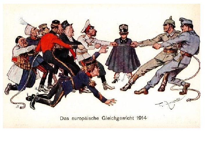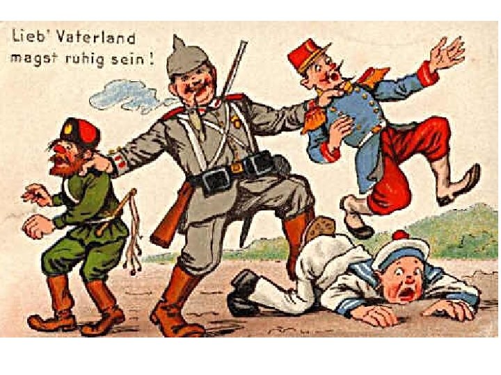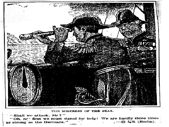 Militarism-Political Cartoons • THE MISTRESS OF THE SEAS • "Shall we attack, Sir? " "Oh, no; first we must signal for help! We are hardly three times as strong as the Germans. “ • March 1915 • This German cartoon is a bitter commentary on how they perceived the British Royal Navy. • The two men in admiral's uniforms are supposed to be British officers.
