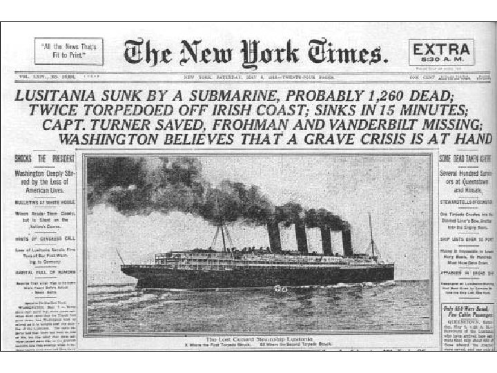 The U. S. Enters The Great War • By 1917, the focus of the war shifted to the sea. • That year the Germans intensified the submarine warfare. • Earlier in 1915, the Germans sank the British liner the Lusitania off the coast of Ireland, which killed 1, 198 persons including 128 Americans. • The American public was outraged. • President Woodrow Wilson sends a strong protest to Germany & they agree to stop attacking neutral & passenger ships, but two months later the Germans sink another British liner & a year later in 1916, the Germans sink a French passenger steamer killing or injuring about 80 passengers. • By 1917, failed crops, as well as a British naval blockade, along the German coast to prevent weapons, food & other military goods from getting through, caused severe food shortages in Germany. • An estimated 750, 000 Germans starved to death as a result of the blockade. • In response, Germany decided to establish its own naval blockade around Britain. • In Jan. 1917, the Germans announce that their subs would sink without warning, any ship found in the waters around Britain – this policy was called unrestricted