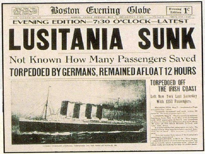 What did it take to get the US involved? 1. Blockades • Lusitania torpedoed, sinking with 1200 passengers and crew (including 128 Americans) German Propaganda Justifying Lusitania sinking • Was eventually found to be carrying 4200 cases of 121 ammunition