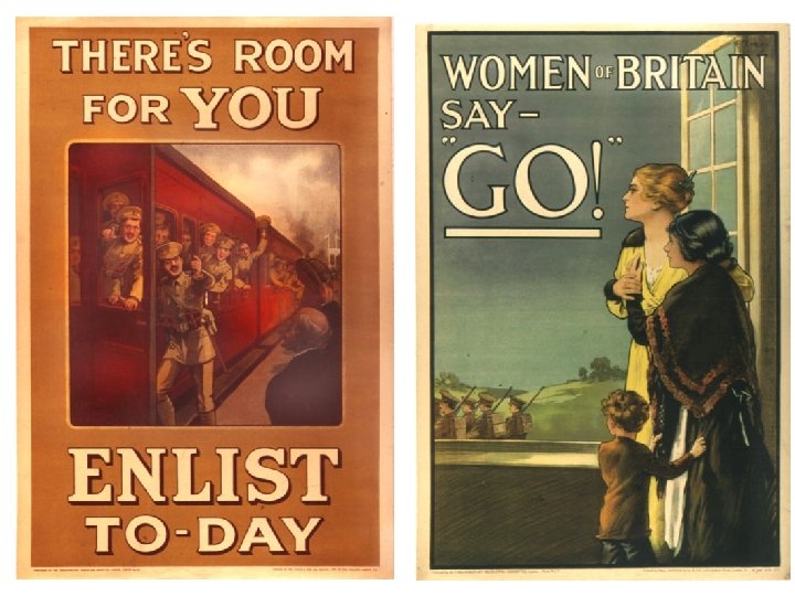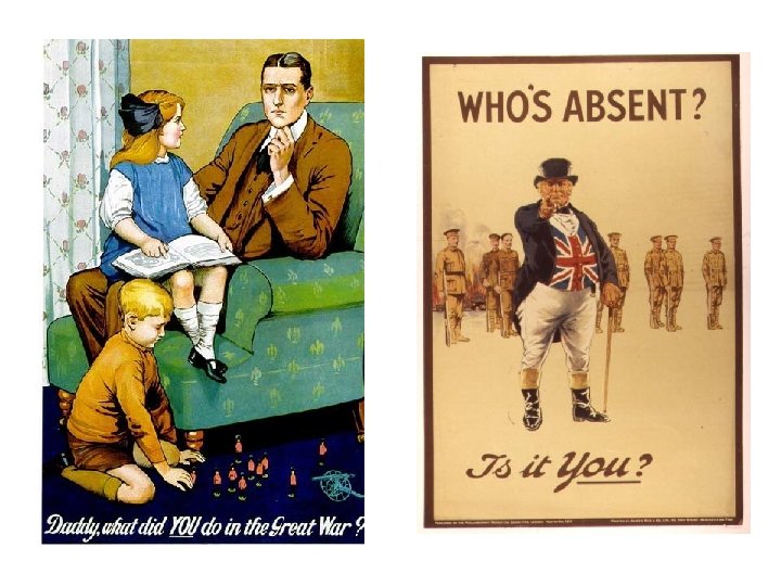 • Posters always showed men ready and willing to fight. • They never showed real fighting taking place. • They played on feelings of patriotism. • Also on male pride and perceptions of manhood