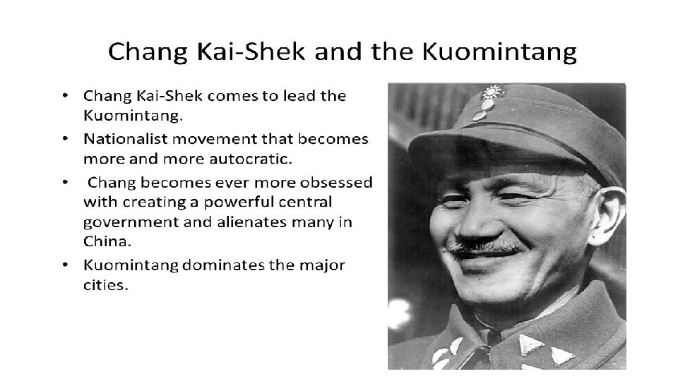 Conclusion • In conclusion the main cause of the Chinese Civil War was the fact that the two ideologically opposed groups were seeking to control a united China. The historical context was important to allowing this to develop. The desire for a united China arose out of the years of division and imperialism experienced within China. • Regionalism in turn contributed to the collapse of the Republic and the warlord era. This era led to an increase in nationalism and essentially left a power vacuum in China. As a result support for the CCP and GMD grew, and the First United Front was provided with the opportunity to seize control. Nevertheless, had the First United Front remained united, the outcome would have been a revolution rather than a civil war. It was the fact that the GMD turned against the CCP, and that both sides were equally matched, which turned this into a long civil war.