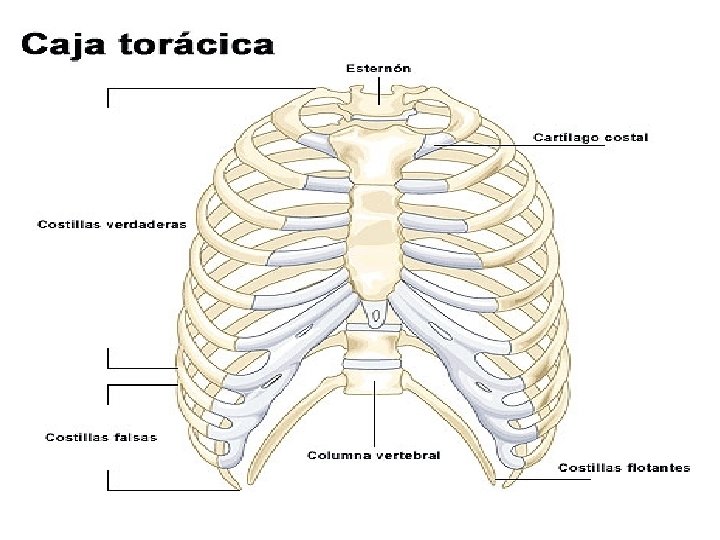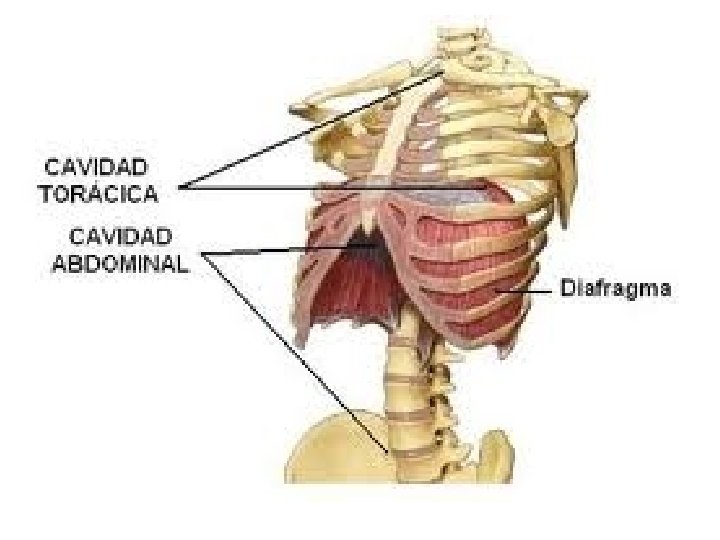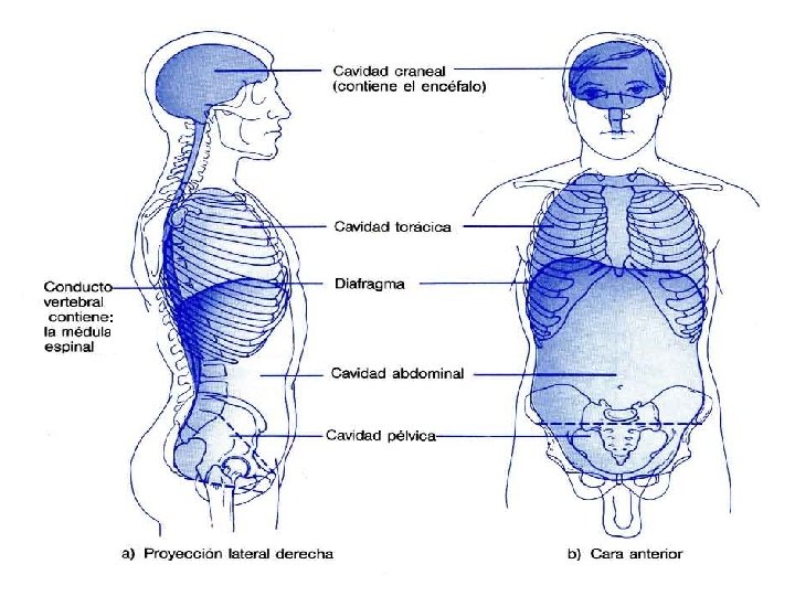 Cavidades Ventrales Ocupan la parte anterior del cuerpo: Cavidad Torácica: Ubicación: Se limita hacia arriba con el cuello. Abajo con el abdomen a través del diafragma, atrás la columna vertebral y lateralmente los arcos costales. Contiene: Tráquea, Bronquios, Pulmones, Esófago, Corazón, Grandes vasos sanguíneos, el Timo y los Linfonodos.