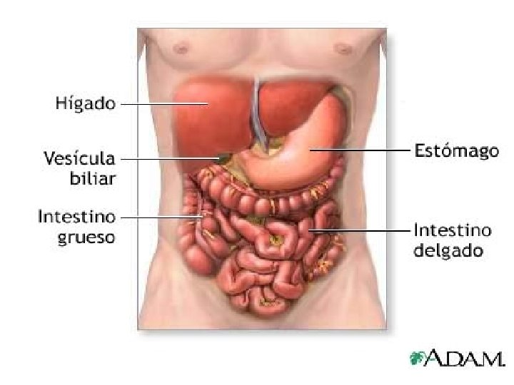 Cavidad Abdominal Órgano Hígado Función Síntesis de proteínas plasmáticas, función desintoxicante, almacenaje de vitaminas y glucógeno, además de secreción de bilis, entre otras Abdominal Vesícula biliar Su función es la acumulación de bilis. Abdominal Estómago Mezcla el bolo alimenticio con los jugos gástricos principalmente. Abdominal Páncreas Produce hormonas, como la insulina y el glucagón, que pasan a la sangre Abdominal Intestino delgado Absorción de los nutrientes necesarios para el cuerpo humano.