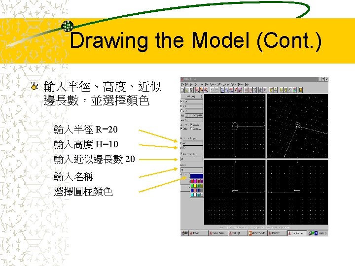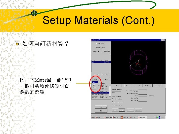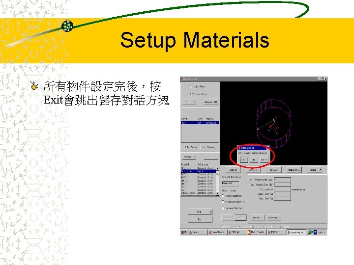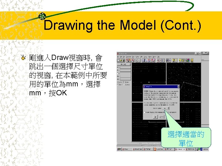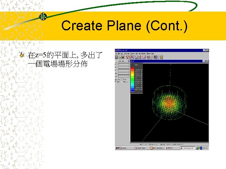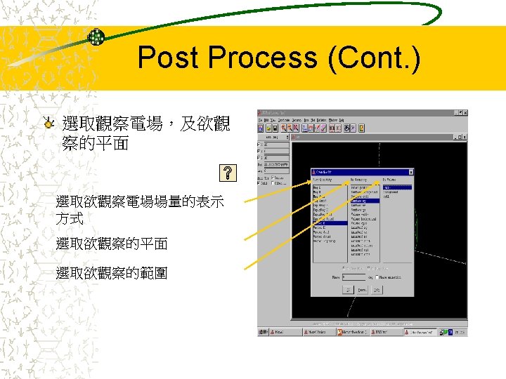 Cavity Model Cavity Size R20 mm H10 mm Slides: 42 Download presentation Cavity Model Cavity Size: – R=20 (mm) – H=10 (mm) – 介電常數 9 R H Entering into the HFSS 按這裡開始 Starting with a New Project Select mode Select wanted mode – With source: Driven solution – Without source: Eigenmode solution – 由於此範例是模擬空 腔共振,故我們選用 Eigenmode solution Drawing the Model (Cont. ) Drawing the Model (Cont. ) 欲畫圓柱座標可到Plot Cylinder選項設定 Setup Materials (Cont. ) Setup Solution (Cont. ) Solve 解完Solution後,可由兩 組數據預先推測結果是 否有誤:Eigen Modes 及 Convergence Eigen Modes 由Circular Cavity的公式, 可推得前三個 Eigenmodes的共振頻率 分別為 1. 9167 G、3. 06 G Convergence (Cont. ) 檢視solution的收斂狀態, 可由Table或Plot Max Delta Frequency來表示 收斂情形 Post Process (Cont. ) 到Post Process Field可以看到模擬結果 Post Process (Cont. ) Plot Field Post Process (Cont. ) 要改看其他mode的場形, 到Data Edit Source調 整想要看的mode Post Process (Cont. ) 要改看其他mode,將原 先的Eigenmode Magnitude改為 0,再將 想觀察的Eigenmode Magnitude改為 1, 如左 圖所示: Eigenmode_1 Magnitude (0, 0) Eigenmode_2 Magnitude (1, 0) 按OK後會跳出一個對話 框, 按‘是’即可 Post Process (Cont. ) 第二個mode的電場分佈 Create Plane (Cont. ) 圈選新增的cutplane名稱