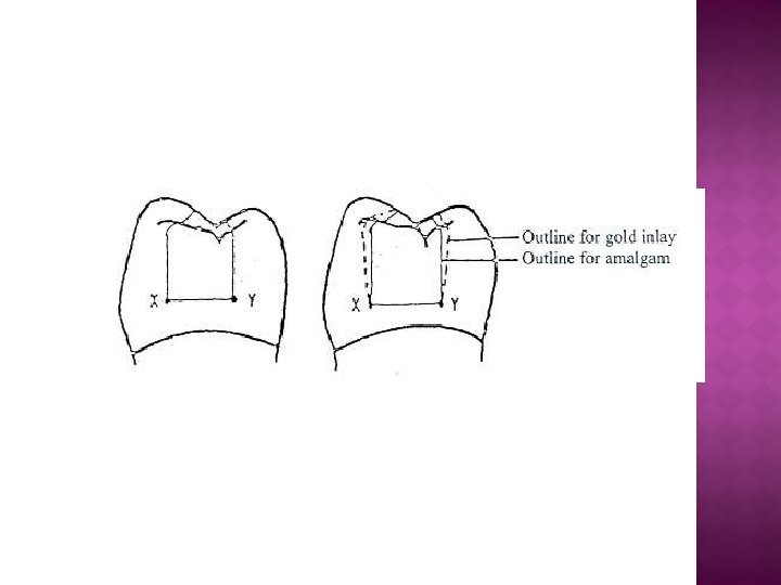 � On the proximal surface, the facial and lingual outlines for amalgam restorations are parallel to the long axis of the tooth and parallel to each other occluso-gingivally. � For the gold inlay, the facial and "lingual outlines diverge as they proceed occlusally from points X & Y to allow withdrawal of the wax pattern.