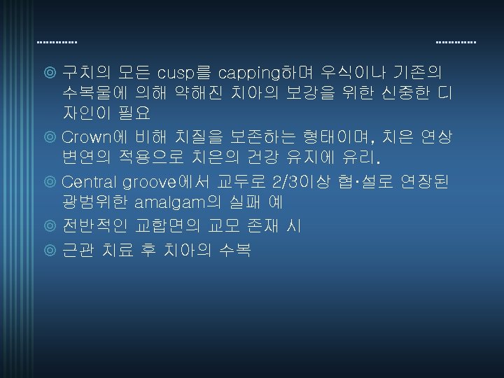 ¥ Occlusal step : Central groove 부위에 0. 5 mm 깊이 의 occlusal step 형성 ¥ Proximal box의 형성 : 인접치와의 간격 확보