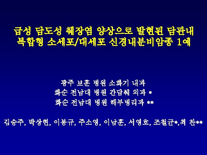 Laboratory finding Lab WBC 5800 /mm 3 Hb 11. 7 mg/d. L Plt 265, 000 /mm 3 ESR 48 mm/hr CRP 15. 0 mg/L BUN/ Cr 18/0. 6 mg/d. L AST/ ALP/ GGTP 336/542/330/1394 IU T-B/ D-B 9. 75/4. 47 mg/d. L Amylase/Lipase 308/1210 U/L HBs Ag/Anti-HBs/Anti-HBc/Anti-HCV (-/+/-/-) AFP 1. 87, CEA 1. 15 ng/d. L CA 19 -9 29. 41 U/d. L