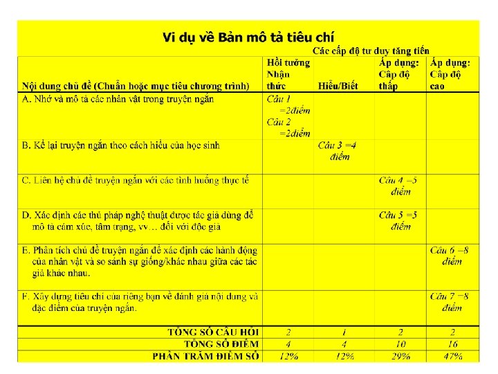 Mô tả tiêu chí Bài kiểm tra là gì? • Là một bảng với các hàng và cột, để phân phối các câu hỏi trong một bài kiểm tra – Các hàng ngang thể hiện số câu hỏi và điểm số cho mỗi chủ đề/chuẩn – Cột thể hiện số câu hỏi và điểm số tương ứng đối với các cấp độ tư duy • Các tên gọi khác – kế hoạch chi tiết, ma trận mô tả tiêu chí, kế hoạch kiểm tra