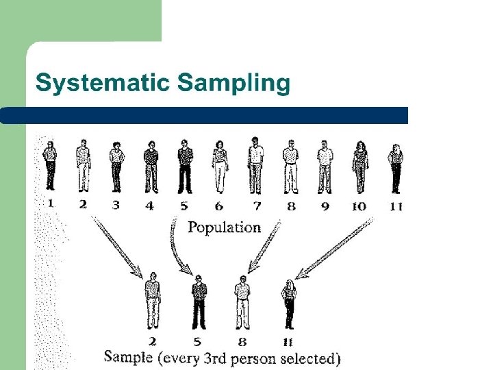 Systematic (or interval) sampling Selecting every nth person from predetermined list of elements or individuals for example selecting every 5 th roll number in a class of 60 students. Advantages: 1. Very easy and rapid method 2. Mistakes in drawing elements are relatively unimportant. Disadvantages: 1. It ignores all persons between two nth numbers 2. Since each element has no chance of being selected in the group, it is not probability random sampling(Black and Champion, 1976) 3. Sampling error increases if the list is arranged in a particular order.