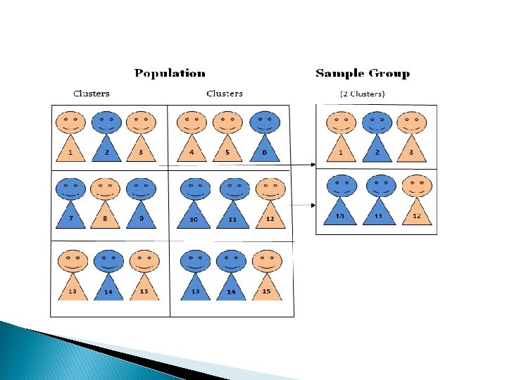 Cluster or Area Sampling If the total area of interest happens to be a big one, a convenient way is to divide the area into a number of smaller non-overlapping areas and then to randomly select a number of these smaller areas (usually called cluster) with the ultimate sample consisting of all (or samples of) units in these small areas or clusters. For example suppose we want to estimate the proportion of machine parts which are defective. Suppose 20000 machine parts are stored in 400 cases of 50 each. Thus 400 cases are clusters here and investigator randomly select n cases and examine all the machine parts in each randomly selected case. If clusters happen to some geographical subdivisions like divisions of territory, states , cities, community, neighborhood, etc. it is called area sampling. Initial cluster are called primary sampling unit, clusters within the primary cluster are called secondary sampling units and clusters within the secondary sampling units are called multi stage clusters. For example dividing one city into wards, each ward into areas, each area into neighborhood, each neighborhood into lanes.