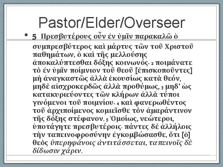 Pastor/Elder/Overseer • Interchangeability • See 1 Peter 5: 1 -5 • See also: • Titus 1: 5 and 1: 7 • 1 Peter 2: 25