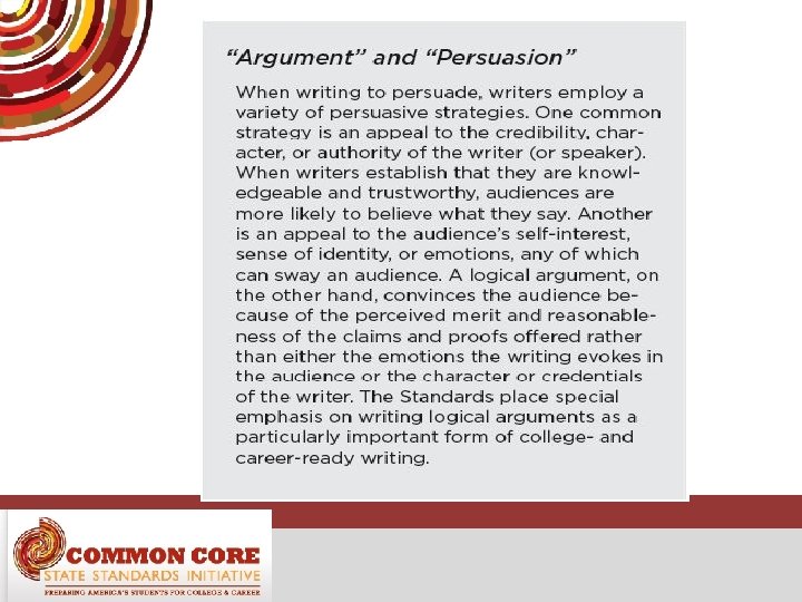 Our Focus arguments While all three text types are important, the Standards put particular emphasis on students’ ability to write sound arguments on substantive topics and issues, as this ability is critical to college and career readiness. When teachers ask students to consider two or more perspectives on a topic or issue, something far beyond surface knowledge is required: students must think critically and deeply, assess the validity of their own thinking, and anticipate counterclaims in opposition to their own assertions. CCSS ELA Appendix A, p. 24