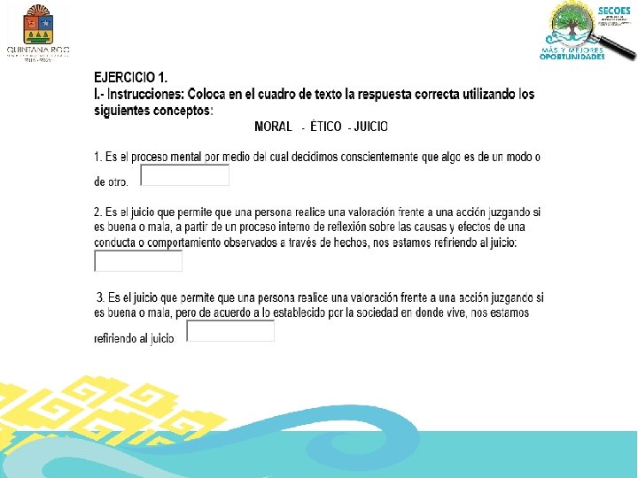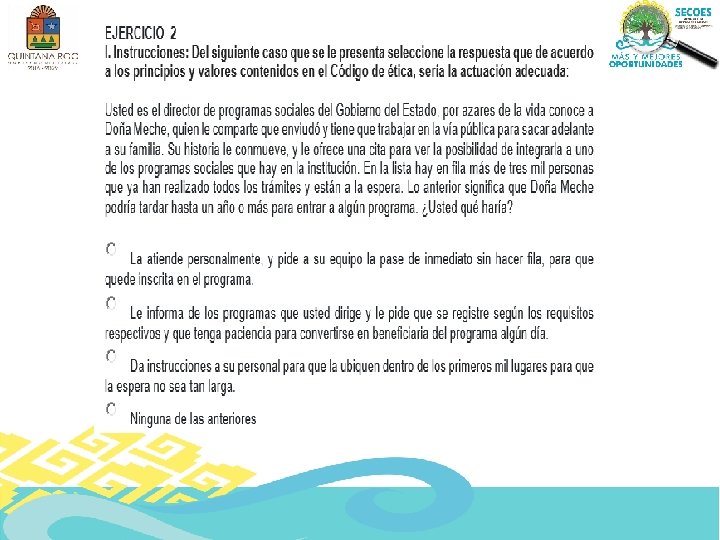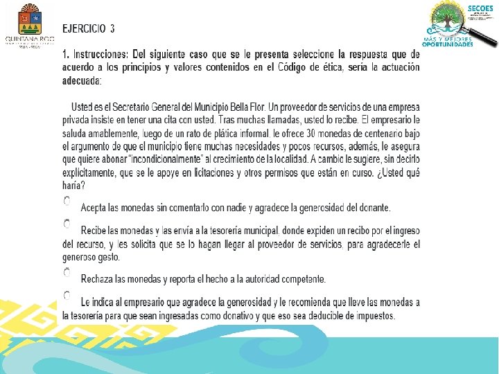 Valores Éticos del Gobierno del Estado de Quintana Roo Los valores éticos se refieren a comportamientos asociados con los principios y contribuyen al desarrollo de conductas ejemplares a través de la promoción de hábitos y costumbres que se consideran importantes y que deben observar todos los servidores públicos en todas sus relaciones públicas y privadas. “una persona comienza a aplicar la ética cuando toma los estándares morales absorbidos de la familia, la religión, el trabajo y los amigos, …” y se comienza a preguntar sobre lo bueno o lo malo de sus actos.