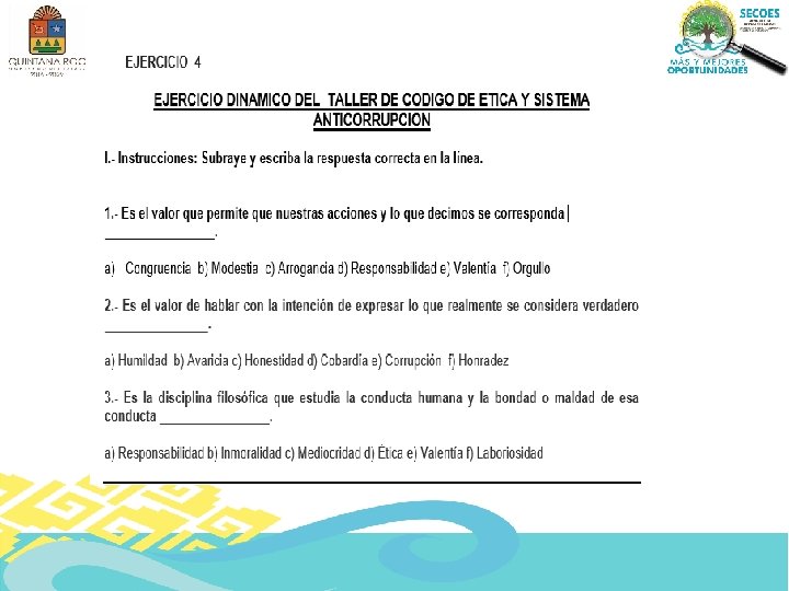 EJERCICIO DINAMICO I. - Instrucciones: Seleccione la opción correcta. 1. - Es el valor que permite que nuestras acciones y lo que decimos se corresponda _________. a)Congruencia b) Modestia c) Arrogancia d) Responsabilidad e) Valentía f) Orgullo 2. - Es el valor de hablar con la intención de expresar lo que realmente se considera verdadero ________. a) Humildad b) Avaricia c) Honestidad d) Cobardía e) Corrupción f) Honradez 3. - Es la disciplina filosófica que estudia la conducta humana y la bondad o maldad de esa conducta _________. a) Responsabilidad b) Inmoralidad c) Mediocridad d) Ética e) Valentía f) Laboriosidad