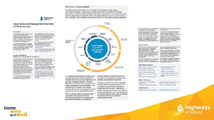 Aim To develop a model, standard and associated procedures that describe the Highways England approach to the asset including the Strategic Road Network (SRN) design, construction, maintenance and operational management. The model, standard and associated procedures will create a consistent framework for Highways England project, scheme and operational management to follow. Where possible the work will consider, replace and amalgamate existing standards, procedures, documents and guidance. Any model and associated documents will also ensure that regulatory requirements are met including CDM 2015.