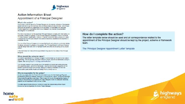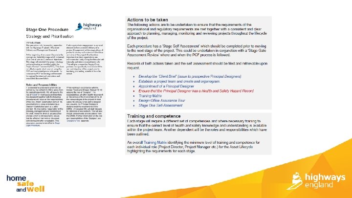 Challenges • Although the legislative requirements with CDM 2015 may be the pre-dominant element within supply chain and project management there are other considerations to be given. • Within Major Projects the Project Control Framework has both health and safety associated products and requirements to be met. • There has to be continual and further alignment with the PCF and CDM Regulations. This will make more practical sense to those in Major Projects. • Other existing documentation including Interim Advice Notes (105) must be considered and amalgamated into the standard and procedures where possible. • Work is carried out on the ‘Asset’ or Strategic Road Network (SRN) which may not be applicable to the CDM Regulations such as non intrusive surveys and inspections • Access to the network by statutory undertakers may not be CDM applicable work but consents and management of the proposed work requires action from operational management is required. • Due to the variances in work and approach to CDM together with the requirements of PCF and Frameworks a traditional approach to a CDM Standard could result in several procedures for the two different directorates (Operations and Major Projects).
