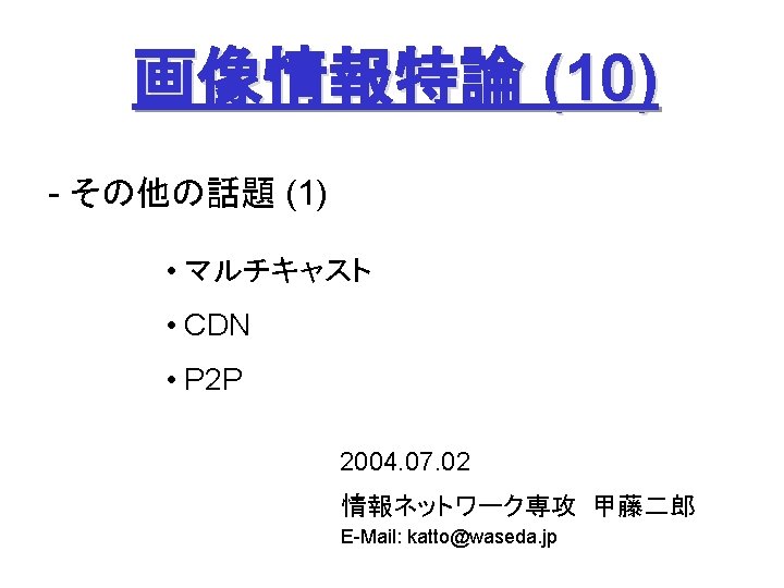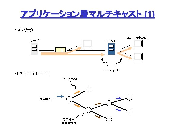 検討課題 • P 2 P をどのようにストリーミングに適用するか? - P 2 P-CDN: cache and replication - P 2 P Multicast: centralized or decentralized - Diversity: path diversity and server diversity Path diversity - いくつかの実験例 Server diversity