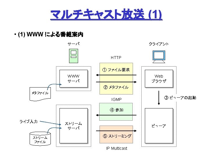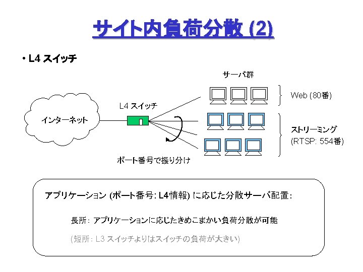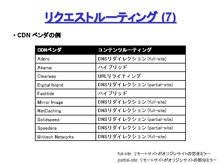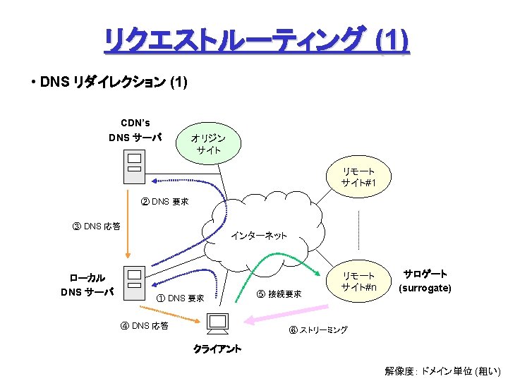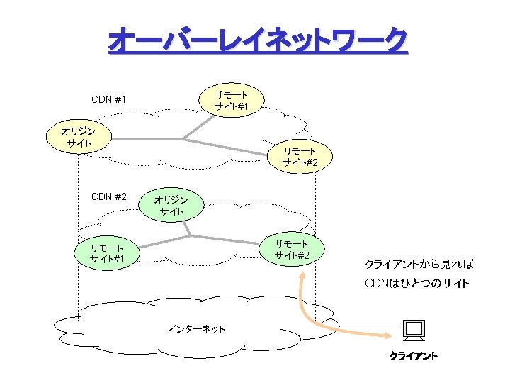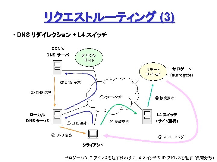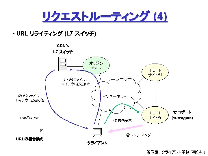 Akamai Free. Flow (1) Origin Site L 7 swtich Origin DNS Akamai DNS Servers オリジナルデータの ミラーリング (オフライン) with Akamizer ① ファイル要求 &応答 ③ DNS検索 監視 ② DNS検索 a 100. g. akamaitech. net → ? ak. foo. com Akamai Contents Servers → a 100. g. akamaitech. net rtsp: //ak. foo. com/… URL ↓ ARL (Akamai Resource Locator) ④ コンテンツ配信 クライアント ① URLリライテイング、③ DNSリダイレクション