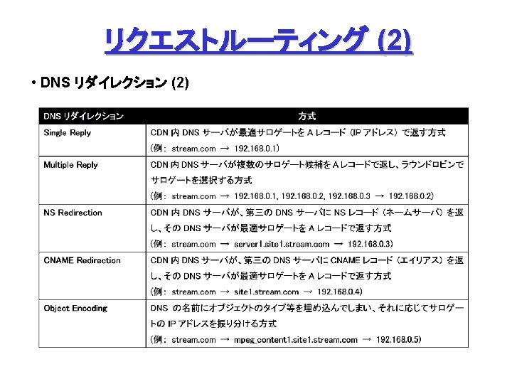 Akamai Free. Flow (2) • Akamai DNS System High-Level DNS Servers (世界中に 13台?) za. akamaitech. net zb. akamaitech. net … zr. akamaitech. net Low-Level DNS Servers (50以上) n 1 g. akamaitech. net n 2 g. akamaitech. net … n 9 g. akamaitech. net Contents Servers (2000以上) a 0000. g. akamaitech. net a 0001. g. akamaitech. net … annnn. g. akamaitech. net