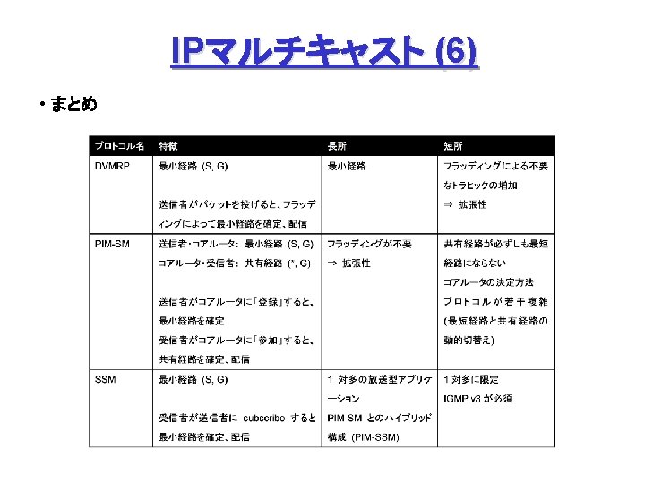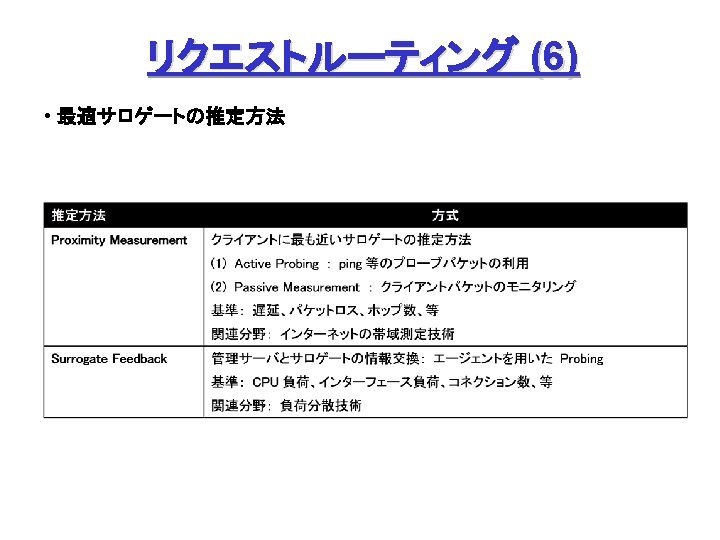 P 2 P (5) Plaxton’s Algorithm ファイル名、ノードアドレス共にハッシュ関数で数値化 … ( Object. ID, Node. ID ) 各ノードは、Object. ID = Node. ID となるファイルの保有ノード情報を保持 (root node) ***8 ⇒ **98 ⇒ *598 ⇒ 4598 の順に探索、発見 (Object. ID = 4598 の場合) Node 04 F 8 ’s Routing Table 04 F 8 *0 F 8 **08 ***0 14 F 8 *1 F 8 **18 ***1 24 F 8 *2 F 8 **28 ***2 34 F 8 *3 F 8 **38 ***3 4598 04 F 8 通信 0325 3425 9098 2 BB 8 **98 IPアドレス Object. ID = 4598 問合せノード 発見 (4598, 3425) 探索 登録 (事前) 7598 4598 87 CA B. Y. Zhao et al: “Tapestry: An Infrastructure for Fault-tolerant Wide-area Location and Routing”.