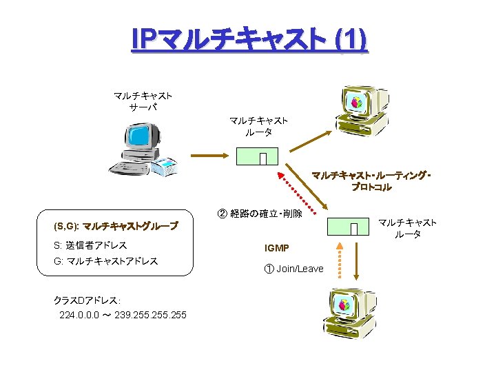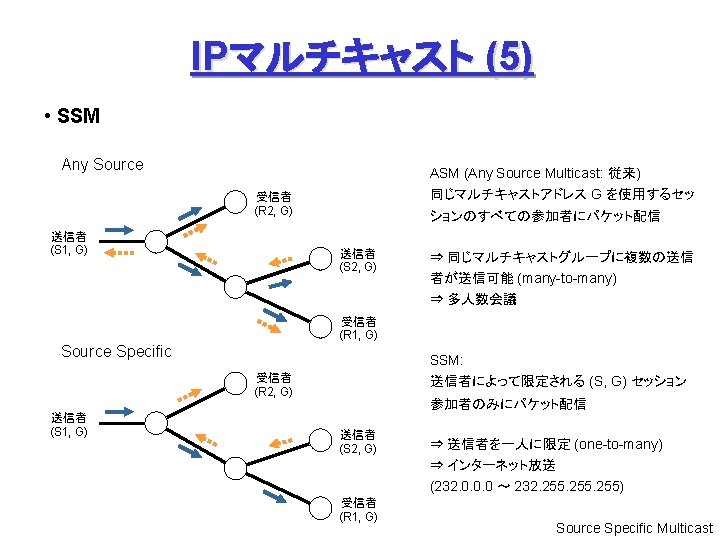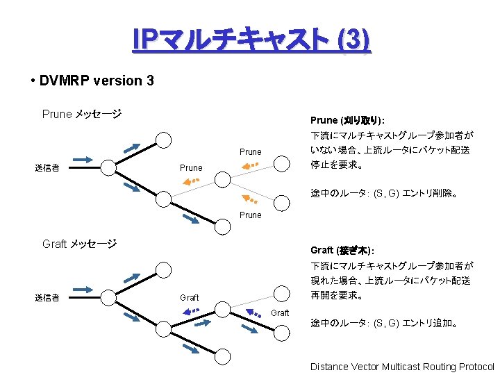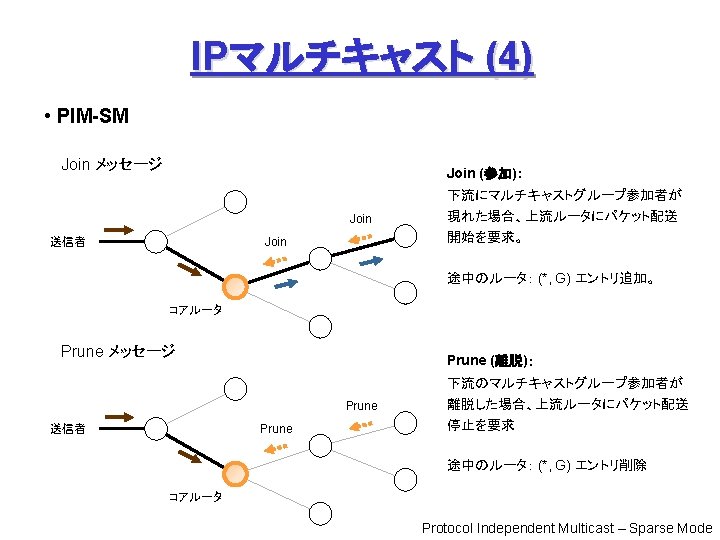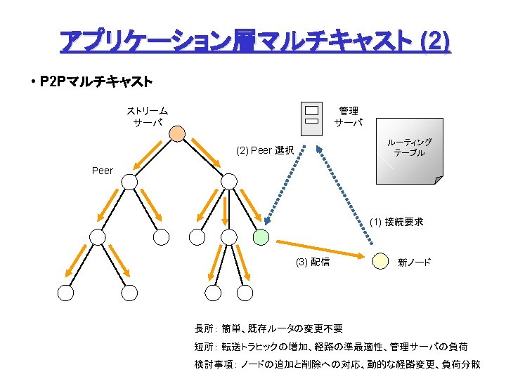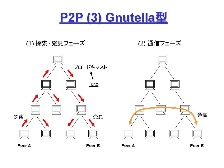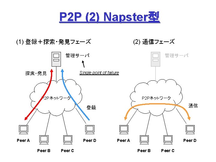P 2 P (4) Freenet 問合せノード: ファイル名をハッシュ関数で数値化 (Key) して問合せ 中間ノード: 問合せ Key に「近い」 Key を持つ peer に順次転送 Node B’s Routing Table Who has Key = 0 x 00 ab 1 ? C ② ① A Peer (IP Address) 0 x 00186… A C E D 0 x 00761… 0 x 013 a 9… 0 x 00 ab 1… ③ B Key (160 bit) ② ④ ⑪後、追加 ⑫ ⑪ ⑥ ④ ⑦ D ⑩ 0 x 00 ab 1 Data Request (探索) ⑤ F ⑧ E ⑨ Data Reply (発見、通信) Request Failed (エラー) I. Clarke et al: “Freenet: A Distributed Anonymous Information Storage and Retrieval System”.