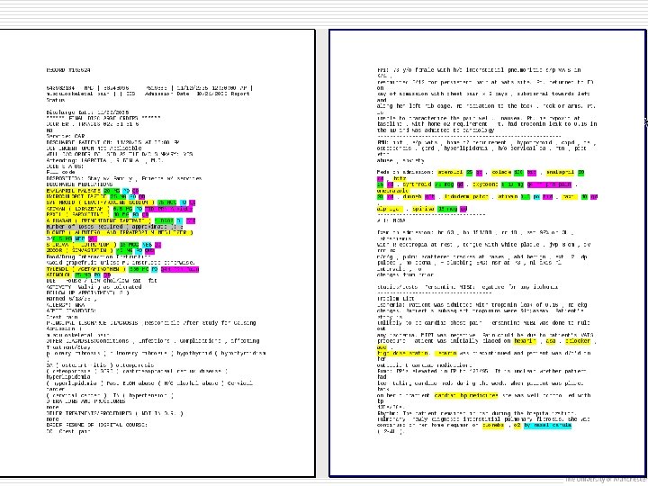 Example: extract status of diseases Uo. M performance (ranked 1 st/28) Micro-average: Accuracy (0. 9723) Macro-average: P (0. 8482), R (0. 7737), F-score (0. 8052) #Eval #Corr #Gold Precision Recall F-score Y 2267 2132 2192 0. 9404 0. 9726 0. 9562 N 56 40 65 0. 7142 0. 6153 0. 6611 Q 12 9 17 0. 7500 0. 5294 0. 6206 U 5709 5640 5770 0. 9879 0. 9774 0. 9826 Yang, H. , Spasic, I. , Keane, J. , Nenadic, G. : A Text Mining Approach to the Prediction of a Disease Status from Clinical Discharge Summaries, JAMIA 16(4): 596 -600
