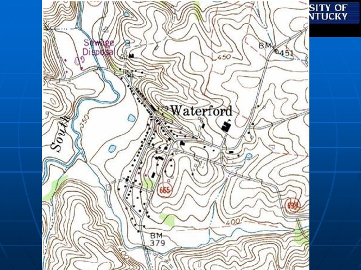 Topography & Contours n Contour Lines identify the ground elevation. • All points along a single contour line have the same elevation. • The interval between contours can represent any convenient distance. (i. e. 1’, 2’, 5’, etc…) n Topography is the location and elevation of features, consisting of both natural and man-made objects.