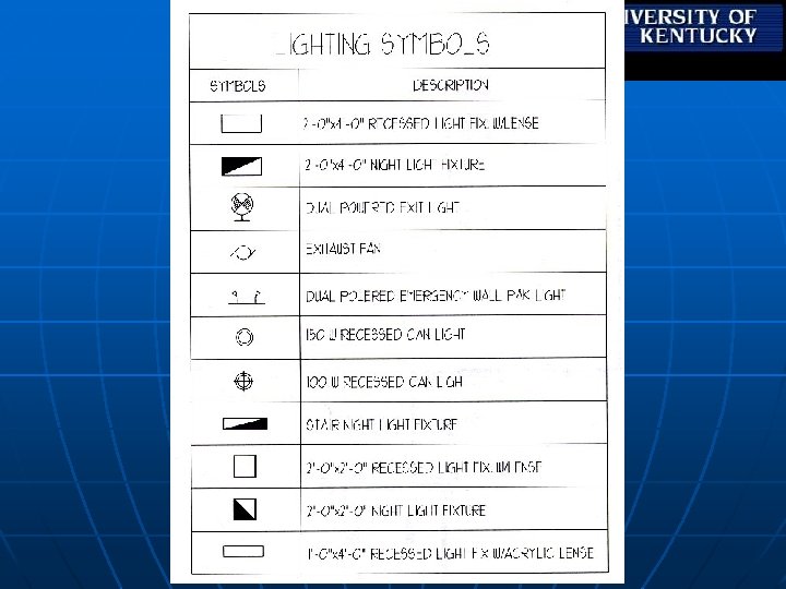 Legends n n List of symbols used to identify features in the drawing. Every symbol and line type used in the drawing will have a corresponding entry in the legend.