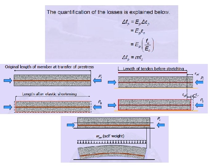 Elastic Shortening • The elastic shortening loss is quantified by the drop in prestress (Δfp) in a tendon due to the change in strain in the tendon (Δεp). • It is assumed that the change in strain in the tendon is equal to the strain in concrete (εc) at the level of the tendon due to the prestressing force. • This assumption is called strain compatibility between concrete and steel. • A linear elastic relationship is used to calculate the strain from the stress.