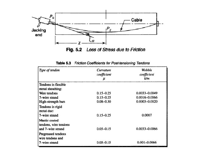 Friction • The friction generated at the interface of concrete and steel during the stretching of a curved tendon in a post -tensioned member, leads to a drop in the prestress along the member from the stretching end. • The loss due to friction does not occur in pre-tensioned members because there is no concrete during the stretching of the tendons. • The friction depends on the following variables. – Coefficient of friction (μ) – Curvature of the tendon (dα) – The amount of prestressing force (P)