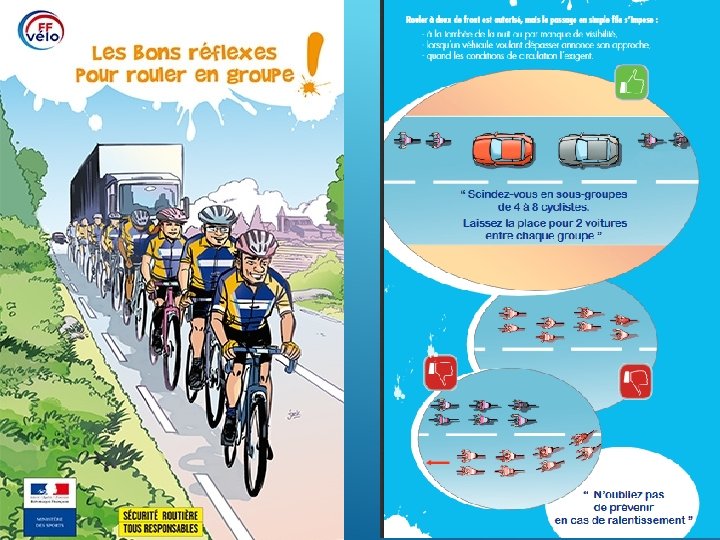 Faire des groupes 4 à 8 vélos en laissant un espace suffisant pour que les voitures puissent doubler et se rabattre. Communiquer sur ses intentions, ou les dangers par la gestuelle ou oralement et faire passer l’information et se repositionner en cas de besoin.