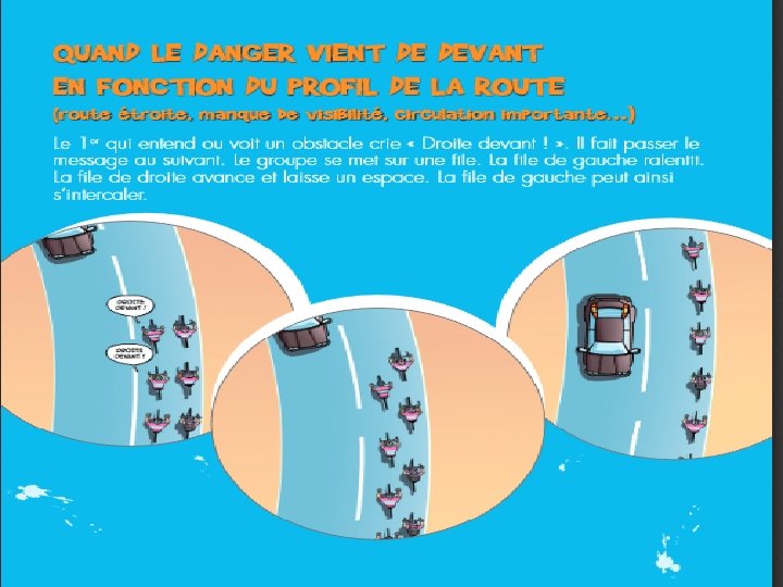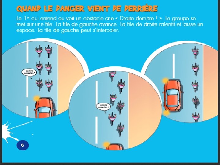 APPLIQUER LE VERBAL ET LA GESTUELLE En situation de “ TOURNER À GAUCHE ” LE GROUPE EN SIMPLE FILE. Le 1 er de la file tend le bras et crie « À gauche ! » . Les suivants passent le message. Après un coup d’œil en arrière, le groupe se déporte à gauche, tout en laissant la voie libre sur la droite pour les voitures