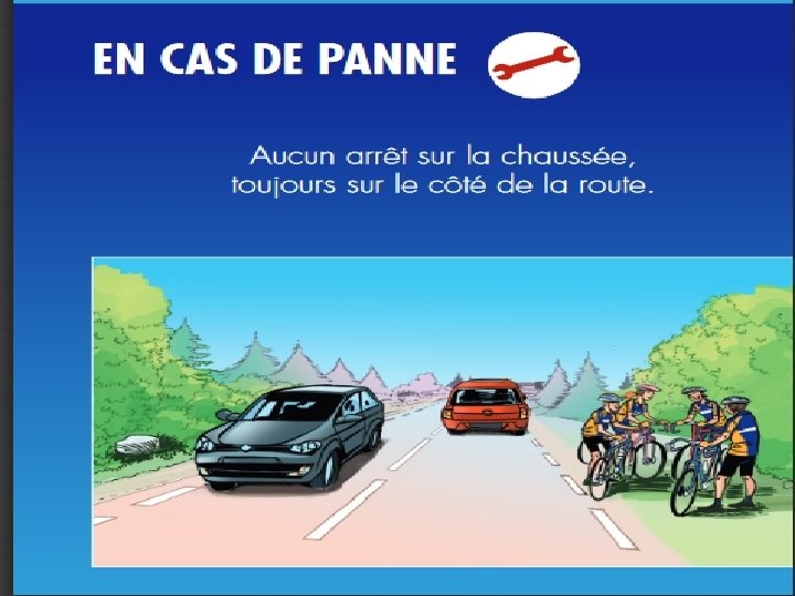EN CAMPAGNE : - Rouler à distance suffisante du bord de la chaussée : - plus visible - éviter les écarts par les ornières, gravillons au bord de la chaussée mal entretenue - Possibilité de rouler à 2 de front, mais sur une file : - à la tombée du jour - véhicule qui vient doubler - conditions atmosphériques(manque de visibilité) - route étroite et sinueuse