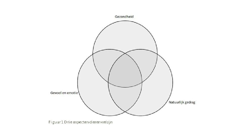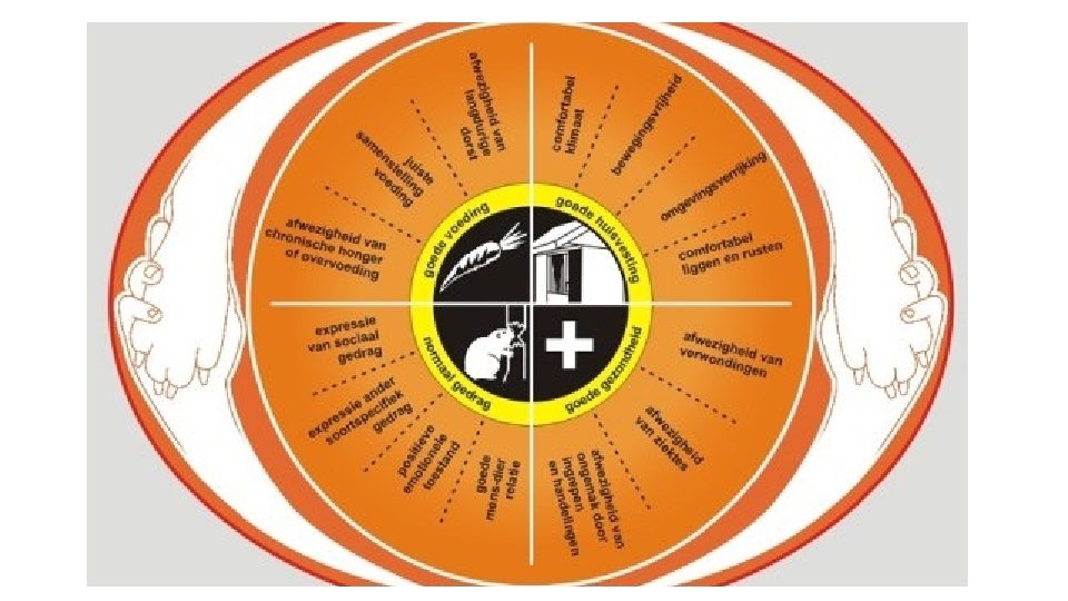 Wat is welzijn? Er zijn verschillende definities van wat dierenwelzijn is. Welzijn is: in harmonie leven met de omgeving. Welzijn hangt af van de hoeveelheid moeite dat een dier moet nemen om zich aan te passen aan de omgeving en zo een toestand te bereiken die als positief wordt ervaren. Drie aspecten zijn met elkaar verbonden als het om dierenwelzijn gaat: Gezondheid (lichamelijke en fysieke gesteldheid) Gevoel en emotie Natuurlijk gedrag