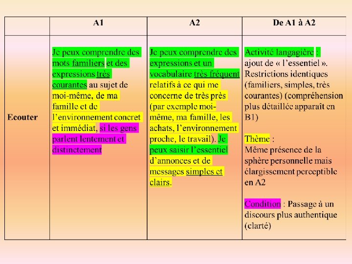 Ecouter A 2 B 1 De A 2 à B 1 Je peux comprendre des expressions et un vocabulaire très fréquent relatifs à ce qui me concerne de très près (par ex. moimême, ma famille, les achats, l'environnement proche, le travail). Je peux saisir l'essentiel d'annonces et de messages simples et clairs. Je peux comprendre les points essentiels quand un langage clair et standard est utilisé et s'il s'agit de sujets familiers concernant le travail, l'école, les loisirs, etc. Je peux comprendre l'essentiel de nombreuses émissions de radio ou de télévision sur l'actualité ou sur des sujets qui m'intéressent à titre personnel ou professionnel si l'on parle d'une façon relativement lente et distincte. Activités langagières On passe dune compréhension de mot simples à une meilleur compréhension qui permet de cerner l’essentiel ( élargissement du champs lexical) Thème : élargissement avec l’entrée de documents audio vidéo authentiques et plus complets Condition: élargissement de la compréhension le discours ne se limite plus à un message mais à des émissions ( le débit doit rester cependant lent)