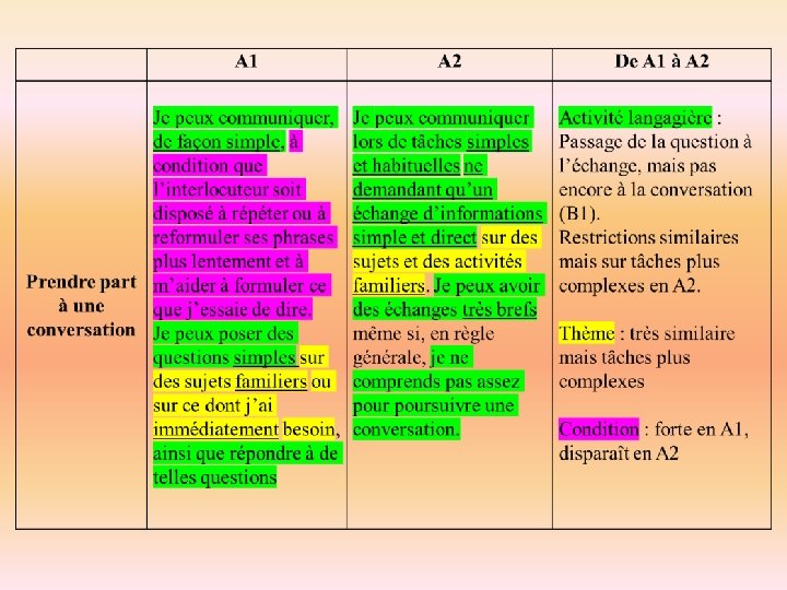 Prendre part à une conversat ion A 2 B 1 De A 2 à B 1 Je peux communiquer lors de tâches simples et habituelles ne demandant qu'un échange d'informations simple et direct sur des sujets et des activités familiers. Je peux avoir des échanges très brefs même si, en règle générale, je ne comprends pas assez poursuivre une conversation. Je peux faire face à la majorité des situations que l'on peut rencontrer au cours d'un voyage dans un pays où la langue est parlée. Je peux prendre part sans préparation à une conversation sur des sujets familiers ou d'intérêt personnel qui concernent la vie quotidienne (par exemple famille, loisirs, travail, voyage et actualité). AL: participation plus active dans les échanges car possibilités de réaction plus grande Thème : élargissement des sujets à appréhender condition : plus d’autonomie de spontaneité