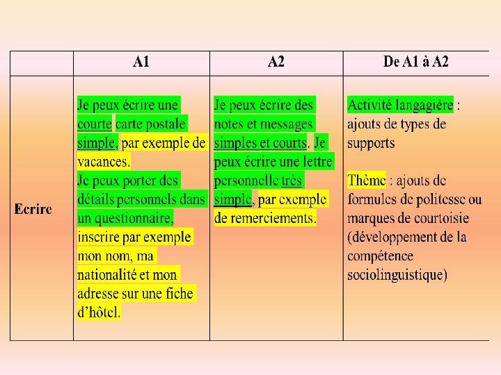 Ecrire A 2 B 1 De A 2 à B 1 Je peux écrire des notes et messages simples et courts. Je peux écrire une lettre personnelle très simple, par exemple de remerciements. Je peux écrire un texte simple et cohérent sur des sujets familiers ou qui m'intéressent personnellement. Je peux écrire des lettres personnelles pour décrire expériences et impressions. AL : semblables (notion de cohérence en plus) T: sujets personnels et maîtrisés