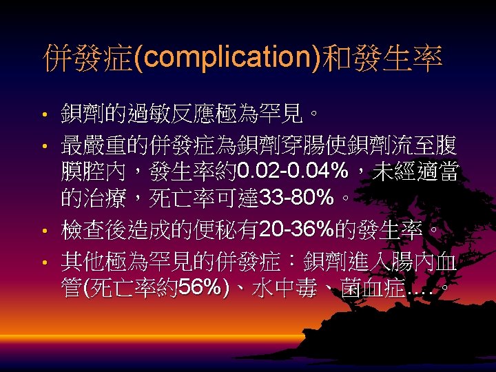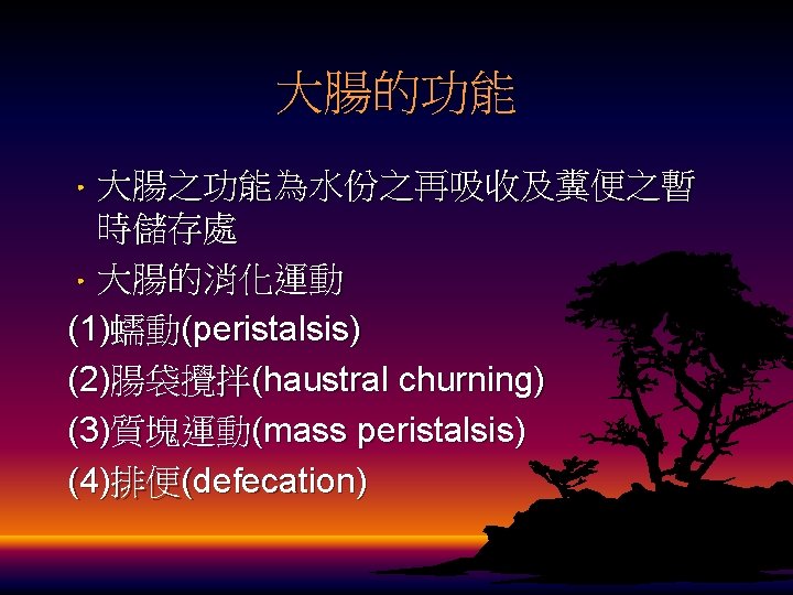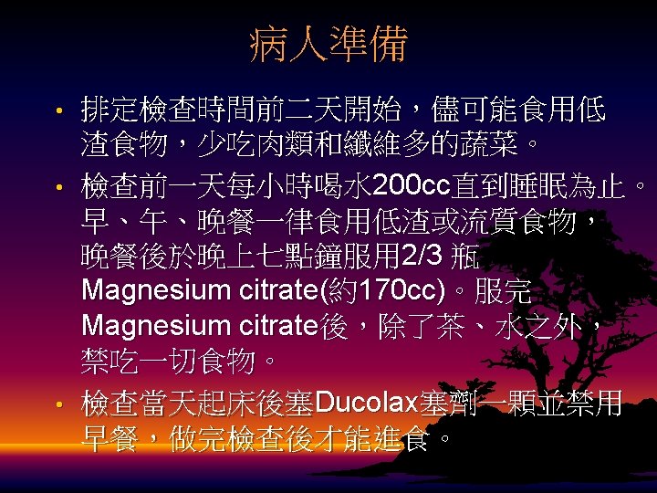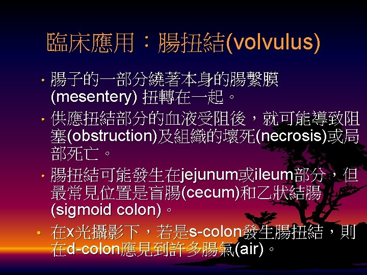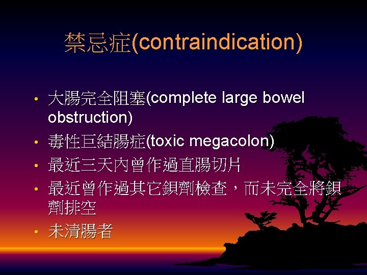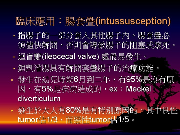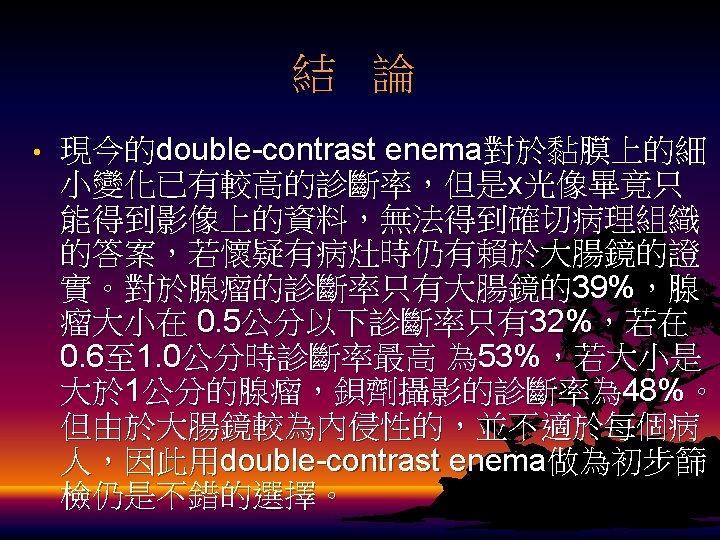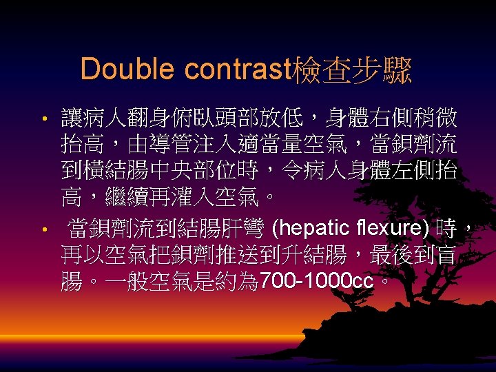 cecum ascending colon transverse colon descending colon sigmoid Slides: 45 Download presentation 大腸的生理解剖 • • 盲腸(cecum) 升結腸(ascending colon) 橫結腸(transverse colon) 降結腸(descending colon) 乙狀結腸(sigmoid colon) 直腸(rectum) 肛管(anal canal) 盲腸(cecum) Sigmoid colon variations in position 檢查類型 雙對比鋇劑灌腸(double contrast barium enema) • 單對比鋇劑灌腸(single contrast barium enema) • 腸套疊攝影法(intussusception) • Double contrast檢查步驟 • • 透視照像:先取rectum AP和Lat,再取scolon、splenic flexure、hepatic flexure 及cecum處照像時應避免讓腸子打結。 最後取prone、supine和standing-view。 double standard double standard Single-contrast檢查步驟 • 前三點與doubole contrast步驟相同。 • 緩緩灌入鋇劑,使鋇劑充滿整個大腸。 • 透視照像:取rectum AP和Lat,再取scolon、splenic flexure、hepatic flexure 及cecum處。 • 最後取鋇劑充盈像(supine)和解後(postevacuation)二張像。 single standard single standard colitis Ulcerative colitis diverticulitis diverticulitis Diverticulum: 1. diverticulitis with spasm of S-colon; 2. multiple diverticulum in hepatic flexure; 3. perforated D-colon diverticulitis Tumor Colonic carcinomas annular colonic carcinomas Colon polyps: 1. pedunculated; 2. Seesile; 3. en face view of a sessile polyp; 4. spot film of a sessile polyp volvulus volvulus Intussusception (幼兒) Intussusception (幼兒) Abdominal soft-tissue mass in RUQ Retrograde obstruction of barium enema over T-colon with coil spring" appearance Intussusception (大人)