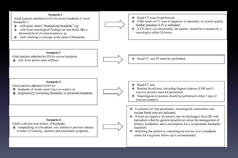 RISULTATI 302 pazienti con cefalea non traumatica su 40000 accessi al PS (0. 7%) Dopo defezioni 256 pazienti Scenario 1 -2 -3 Scenario 4 Indeterminato (97 pz) (120 pz) (39 pz) Rimasti dopo Followup Scenario 1 -2 -3 (77) Scenario 4 (103) Indeterminato (31)