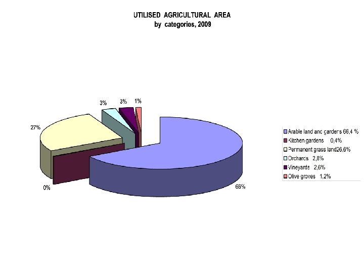 LAND USE 2009. Out of the total agricultural land of 3. 137. 000 ha, 1. 300. 000 ha or ca. 42% is utilised agricultural area (UAA) out of which: • 863. 023 ha are arable land gardens (66, 4 %) • 343. 306 ha are permanent grassland (26, 4 %) • 36. 659 ha are orchards (2, 8 %) • 34. 380 ha are vineyards (2, 6 %) • 15. 304 ha are olive groves (1, 2 %) • 7. 328 ha other (0, 6 %)