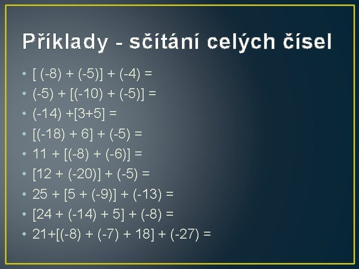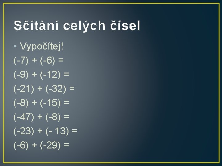 Sčítání celých čísel • Sčítáme-li dvě kladná čísla: • Sečteme je jako čísla přirozená 8 + 6 = 14 • Sčítáme – li dvě čísla záporná: • Sečteme obě čísla jako čísla přirozená (bez ohledu na znaménko) (-5) + (-6) = ? 5 + 6 = 11 • K součtu přidáme znaménko mínus (-5) + (-6) = - 11