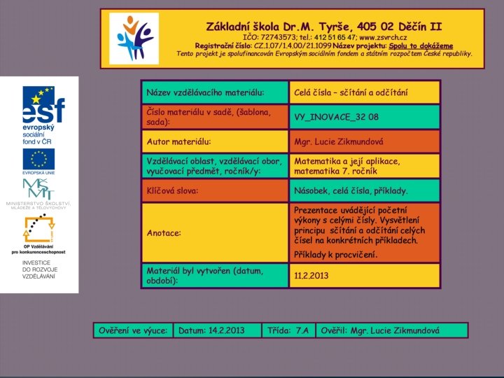 Sčítání celých čísel a+b=c sčítanec + sčítanec = součet • My jsme se zatím seznámili se sčítáním přirozených čísel • Nyní se budeme zabývat sčítáním i čísel záporných
