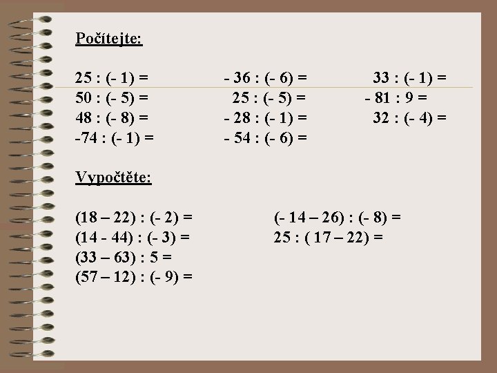 Doplňte x tak, aby byl výsledek správný: 45 : x = - 9 42 : x = - 7 - 33 : x = - 11 - 45 : x = 9 62 : x = - 2 - 64 : x = 8 - 27 : x = 9 - 90 : x = 10