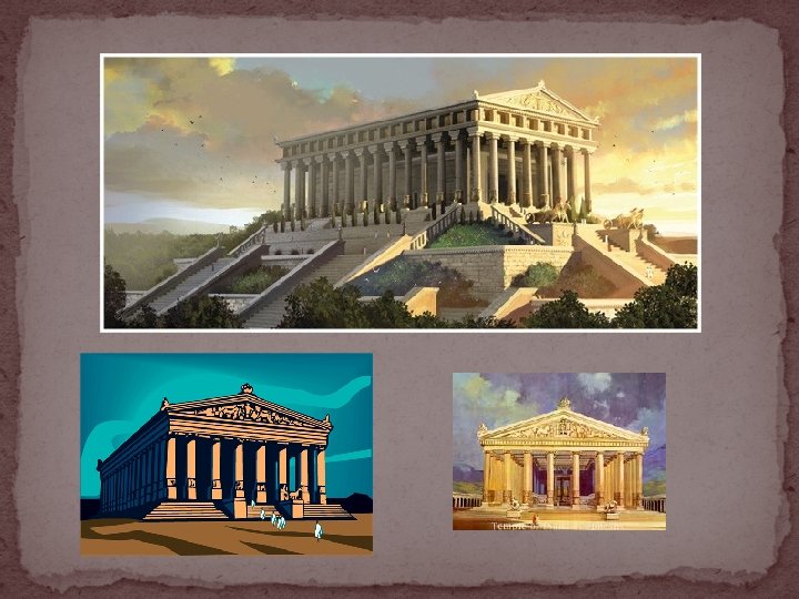 Templul zeiței Artemis din Efes (Templul Dianei) Din acest edificiu antic grec nu au rămas decât fundația și puține relicve. Cu excepția acoperișului, întregul templu a fost construit din marmură. Terminat în anul 550 î. Hr. , acest templu (situat azi în. Turcia) a fost construit timp de 120 de ani. În interiorul templului se află statuia de 2 m a zeiței Artemis, acoperită cu aur și argint. În 356 î. Hr. , templul a ars într-un incediu; reconstruit de Alexandru cel Mare, templul este din nou distrus de goți. Refăcut din nou, acest templu păgân este închis în anul 391 d. Hr. și, în anul 401 d. Hr. , este distrus definitiv la comanda Sfântului Ioan Gura de Aur, Patriarhul Constantinopolului – unul din cei 3 Mari Ierarhi ai Bisericii Ortodoxe. Din blocurile de marmură ale Templului zeiței Artemis s-au construit ulterior alte edificii.