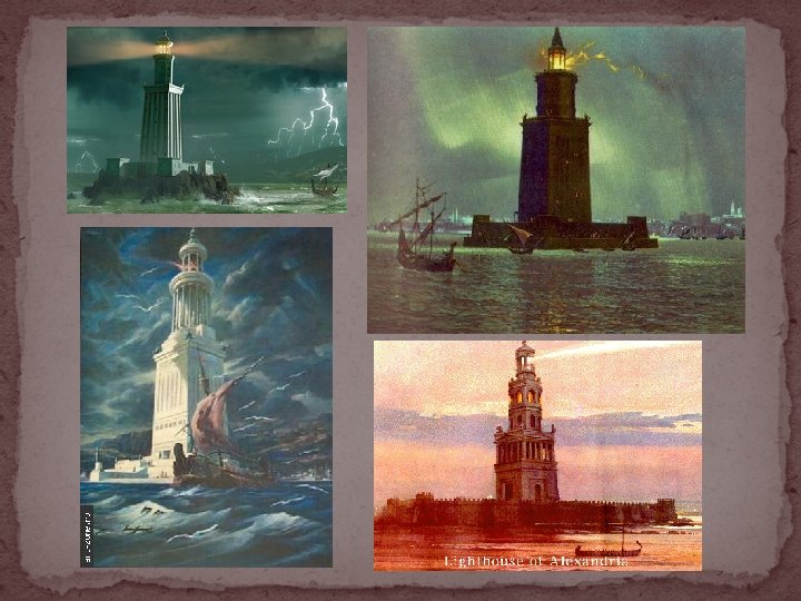 Farul din Alexandria Cu o înălțime cuprinsă între 115 și 135 m, această construcție a fost timp de multe secole cea mai înaltă clădire construita de om. Acest far a fost construit în secolul 3 î. Hr. în Egipt, pe Insula Pharos – de aici provine termenul de “far” (turn de iluminare folosit ca reper în navigație). La început, aceasta construcție a fost doar un simbol al portului, apoi a devenit indicator pentru marinari. Acest far era construit din blocuri uriașe de marmură albă și avea trei niveluri separate. În mijloc secțiunea farului era de forma octogonală, era gol pe dinăuntru și avea o înălțime de 30 de metri. Din interior ieșeau flăcări care nu se stingeau niciodată, luminând atât noaptea cât și ziua și făcând vizibil drumul spre port. Se spunea că flacăra se vedea de la 50 -60 km depărtare. Farul a fost distrus de 2 mari cutremure– din 1303 și 1323. În 1480, s-a construit o fortăreață pe locul farului, folosind structurile și pietrele rămase. În 1994, aproape de orașul Alexandria, niște scafandri au găsit în mare ruinele farului.