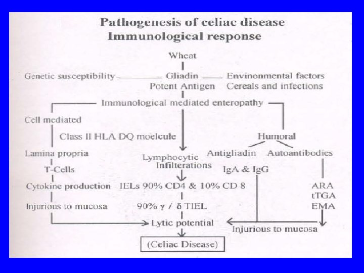 • Main damage in Celiac disease occurs in small intestine which is characterized by -- intraepithelial lymphocytosis -- crypt hyperplasia -- villous atrophy