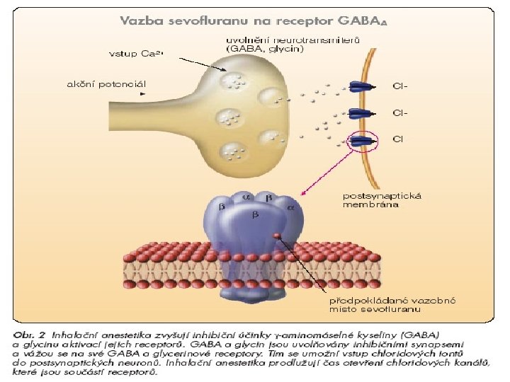 Celková anestetika • Místa působení – CNS: Mozková kůra, retikulární systém, talamus, mícha • Účinek – Anestetika brání přenosu nervových vzruchů • Snížení aktivity excitačně působících synapsí, zvýšení aktivity inhibičně působících synapsí, synaptické kanály pro Ca a Cl závislé na ligandech - Cl kanály aktivované GABA nebo glycinem jsou anestetiky (propofol, barbituráty, benzodiazepiny, inhalační anestetika) ovlivněny • Zvýšení klidového membránového potenciálu – hyperpolarizace • Útlum neuronů majících funkci tvorby vzruchů – neprobádané – dýchání, srdeční frekvence – ovlivněny anestetiky