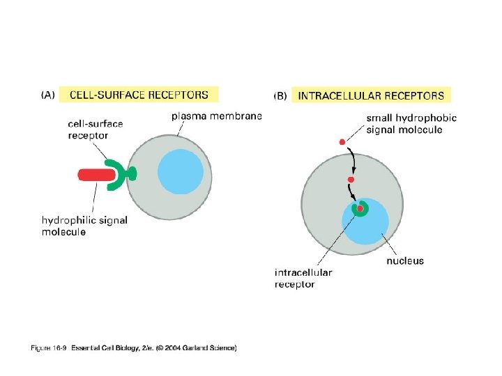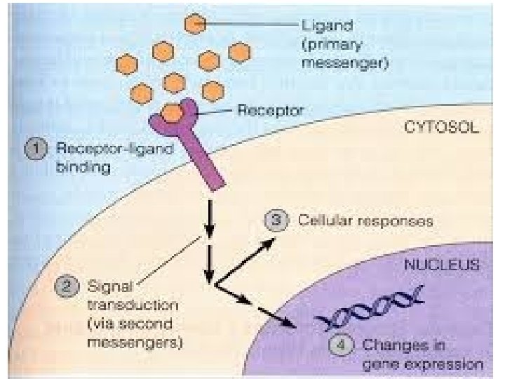 • The message carried by a ligand is often relayed through a chain of chemical messengers inside the cell. • Ultimately, it leads to a change in the cell, such as alteration in the activity of a gene or even the induction of a whole process, such as cell division. • Thus, the original intercellular (between-cells) signal is converted into an intracellular (withincell) signal that triggers a response.