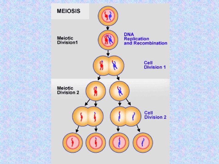 • Meiosis reduces the number of chromosomes to half the number in somatic cells. This process requires two successive cell divisions. • Meiosis I (reduction division) • Meiosis II
